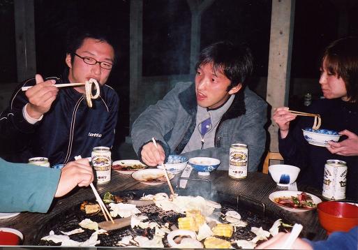 肉を焼く宮本さんとタマネギを吟味するおしり
