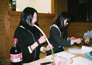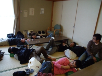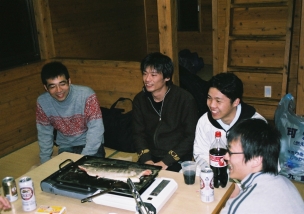 寒いのでみんなで固まって食べた。